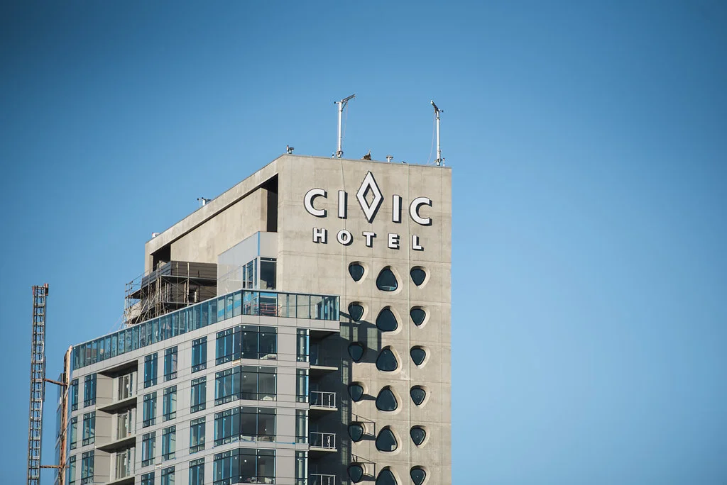 Sign Specifications: 10" thick aluminum channel letters with LED illuminated white polycarbonate faces. This sign is flush mounted to the Hotel, towering at over 525' (160m) above ground.