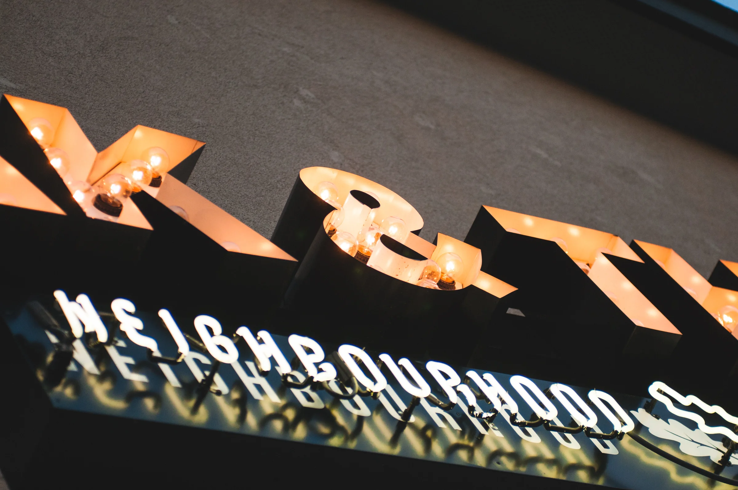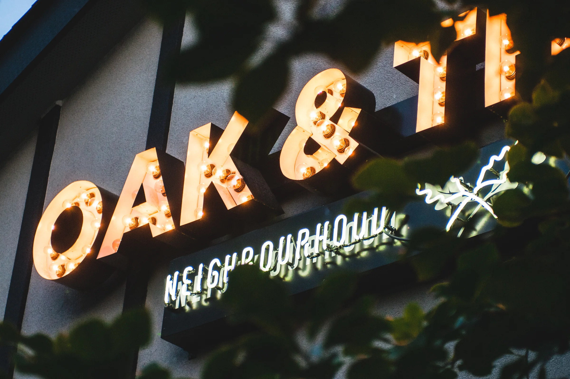 Client: Oak & Thorne Neighbourhood Public House, Langley BC.Sign Specifications: Open face channel letters with exposed bulbs. White neon sign mounted to backer panel.