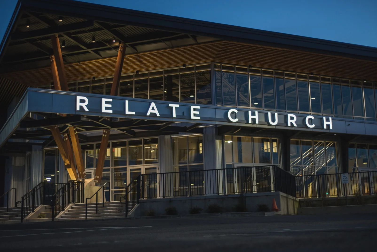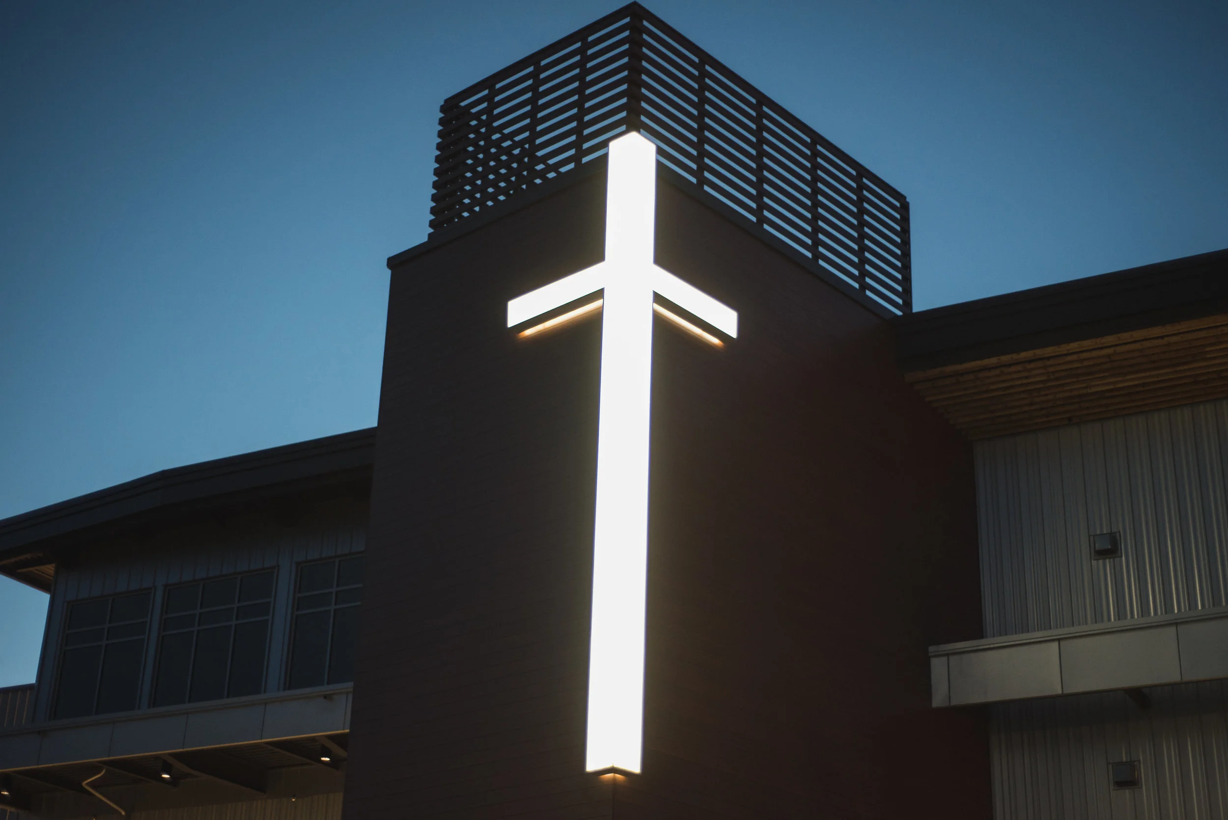 Cross Sign: Face & halo-lit illuminated custom channel shape. Sign is mounted to corner of building with stand-offs.