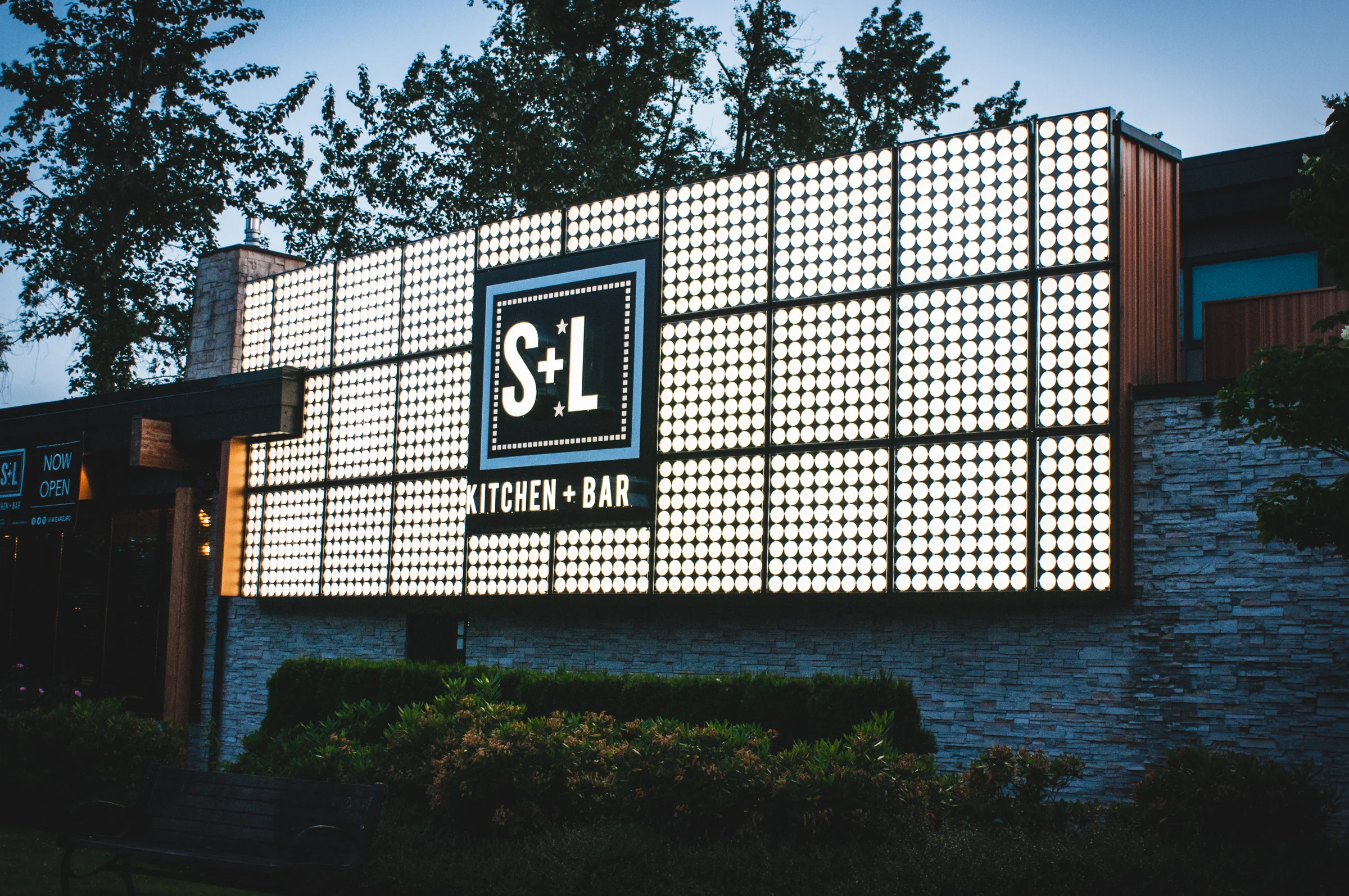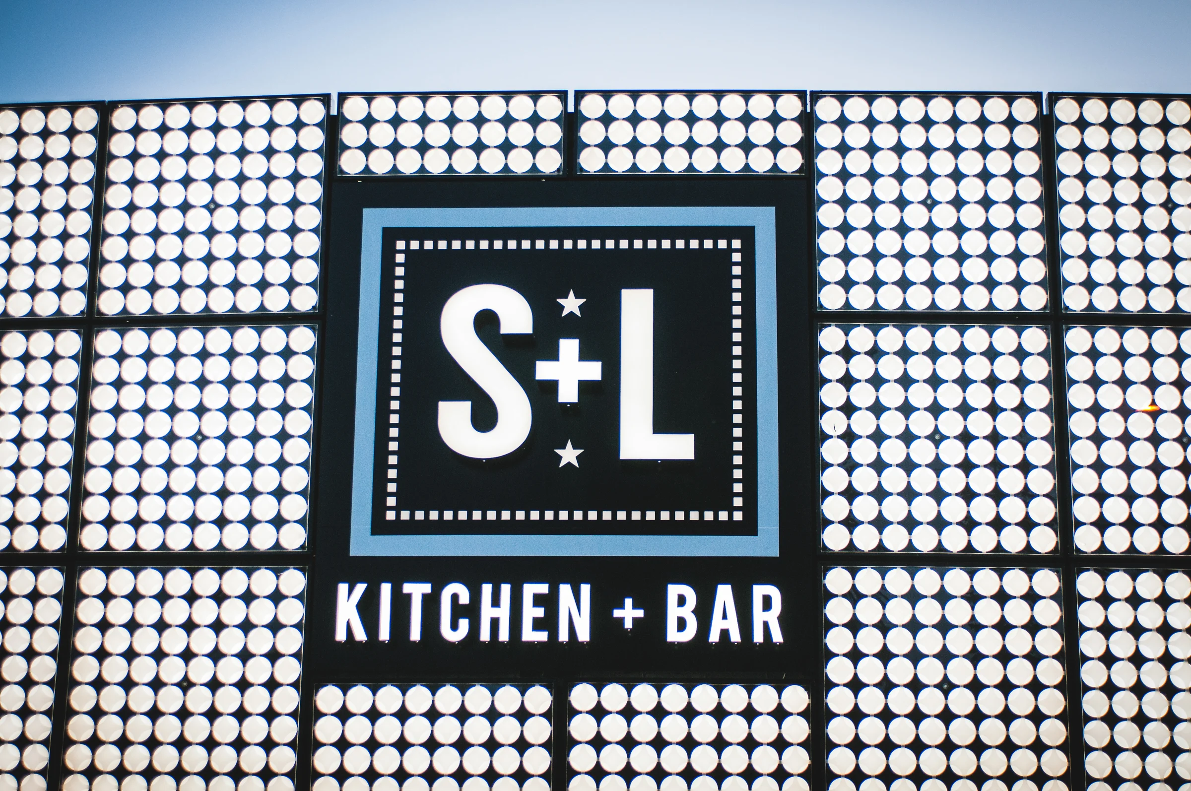 Client: S+ L Kitchen & Bar.Sign Specifications: Face-lit channel letters with chrome returns.Display Specifications: Internally illuminated multi-layered panels with graphics applied.